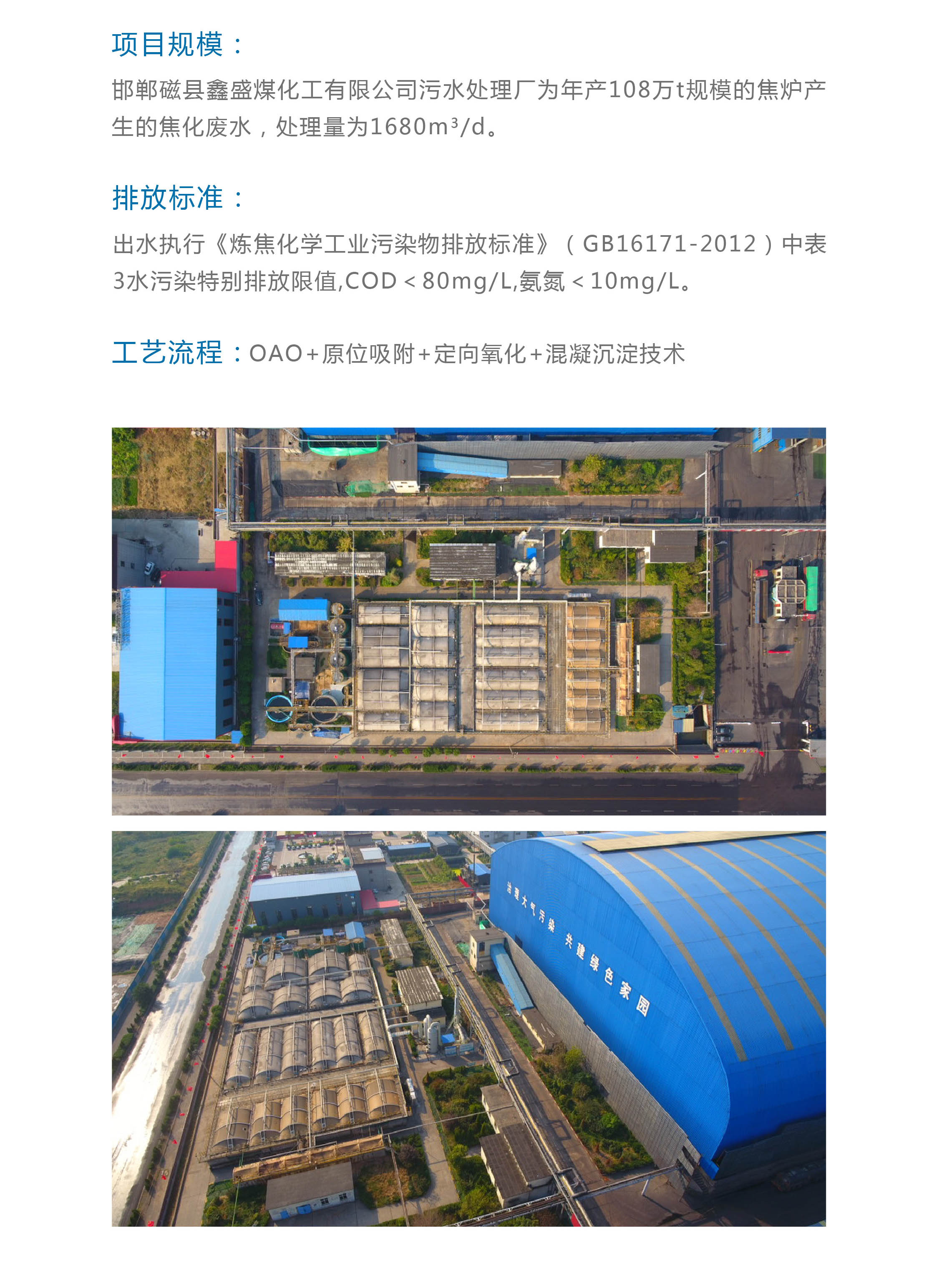 邯鄲磁縣鑫盛煤化工(gōng)公司爲108萬T/A規模的焦爐産生(shēng)的焦化廢水,污水處理(lǐ)規模每天1680噸。成分(fēn)主要污染物爲揮發酚、氰化物、COD、氨氮等,生(shēng)活污水中也含大(dà)量的有機(jī)物和懸浮物。