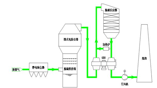 此次文豐鋼鐵改造的#1、#2燒結機(jī),其煙氣淨化采用“石灰石膏濕法脫硫+GGH換熱(rè)(冷(lěng)側)+煙氣升溫+中高溫SCR脫硝(300℃以上)+GGH換熱(rè)(熱(rè)側)+引風(fēng)機(jī)+原煙囪排放(fàng)”的工(gōng)藝。設計(jì)系統進口SO2濃度3000mg/Nm³,NOx濃度350mg/N,顆粒物100mg/N,設計(jì)出口SO2排放(fàng)濃度<35mg/N、NOx排放(fàng)濃度<50mg/N、顆粒物<10mg/N。燒結煙氣經濕法脫硫和濕電除塵後煙氣溫度爲50℃左右,進GGH換熱(rè)(冷(lěng)側),經過換熱(rè)煙氣溫度升溫到爲280℃,再通過加熱(rè)爐升溫到300℃以上進入脫硝反應器,脫除NOx後的淨煙氣回到GGH換熱(rè)(熱(rè)側),經過換熱(rè)降溫,煙囪排放(fàng)煙氣溫度爲101℃左右。在實現超低排放(fàng)的同時,實現煙氣脫白(bái)效果。目前,整套系統運行穩定,再次驗證了中科(kē)朗博的技術(shù)實力。