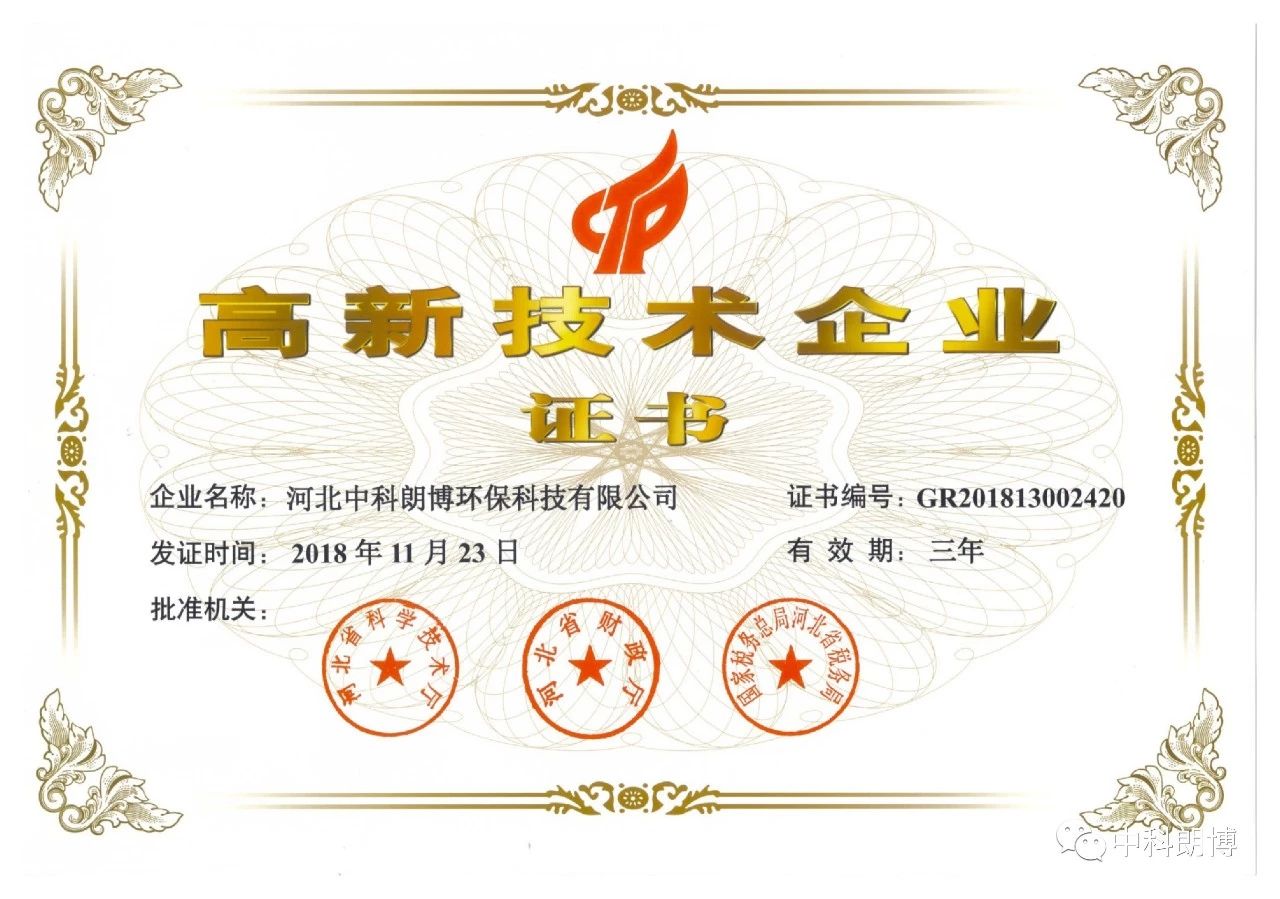 2018年(nián)11月23日(rì),河北省科(kē)協技術(shù)廳、河北省财政廳、國(guó)家稅務總局河北省稅務局聯合批準河北恩賽環保科技有限公司(以下簡稱公司)高新技術(shù)企業資質申請(qǐng)。2019年(nián)4月26日(rì),公司順利領取高新技術(shù)企業證書(shū)。這是公司繼通過科(kē)技型中小企業資質、ISO9000質量體(tǐ)系認證後的又一技術(shù)榮譽。